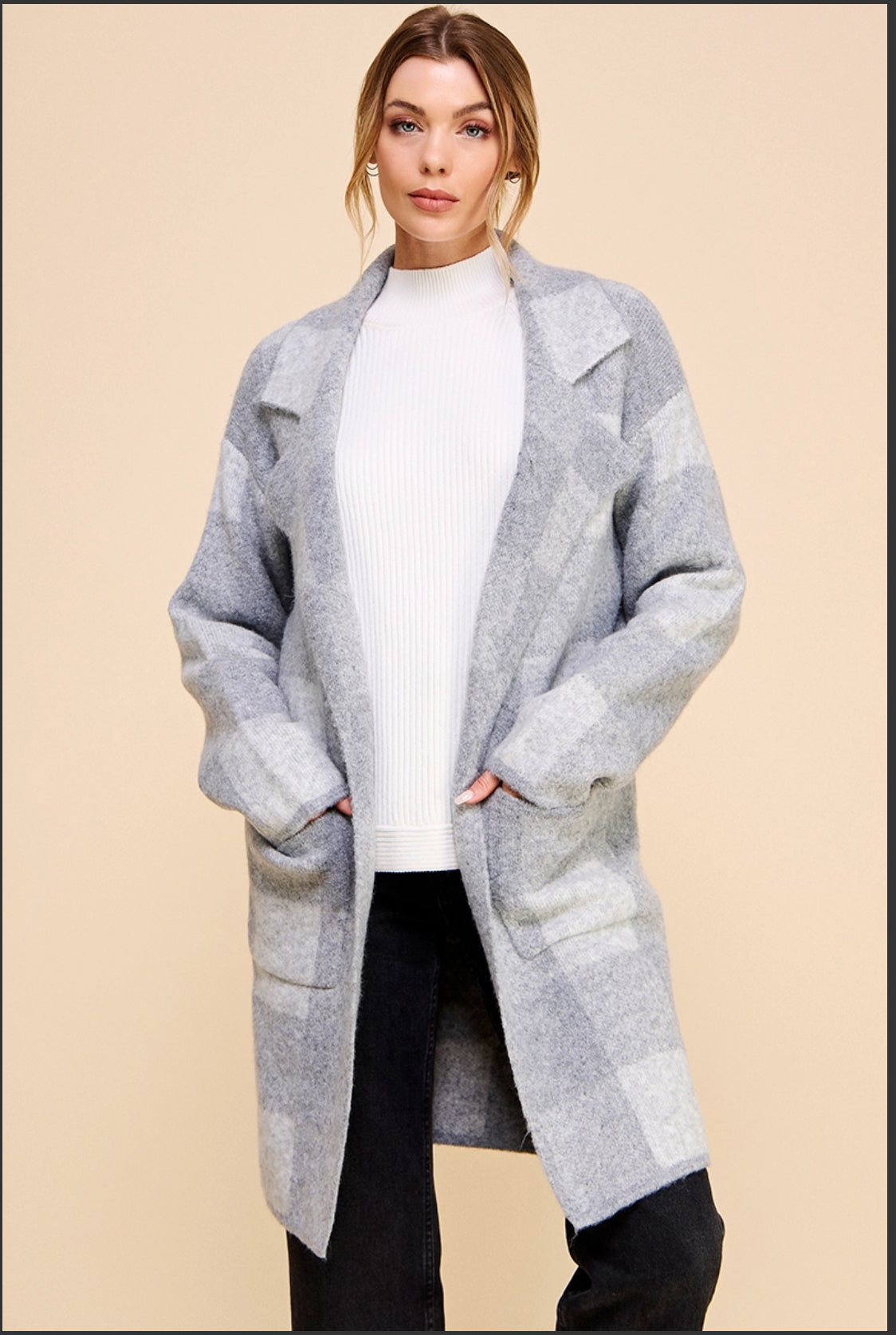 Elevate your layering game with this gray cozy plaid long cardigan. Crafted for warmth and style, it features a soft fabric blend and an elongated silhouette to provide comfortable coverage during cooler days. The classic plaid pattern adds timeless sophistication, making it ideal for both casual and refined outfits. Perfect for professionals seeking a polished yet relaxed look, this cardigan blends functionality with expert design.